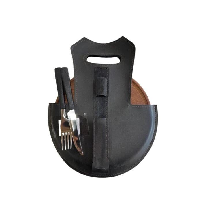 Incluye: Porta plato de ecocuero + Plato de asado N°20 + Cubiertos cabo de plástico